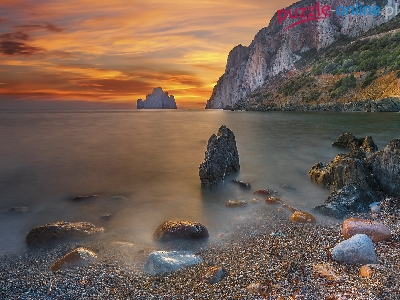 Zachód słońca, Góry, Morze, Kamienie, Skały