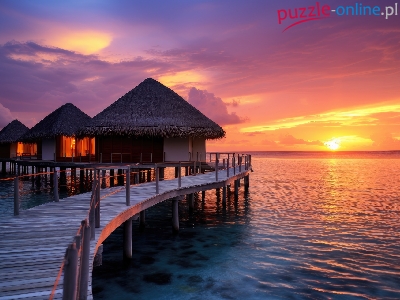 Pomost, Zachód słońca, Morze, Domki, Grafika, Bungalow
