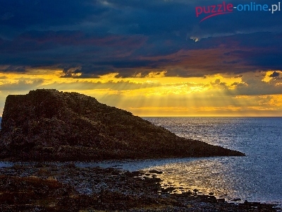 Morze, Chmury, Zachód, Słońca, Skała