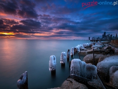 Morze, Kamienie, Zachód, Słońca, Oblodzone