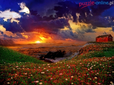 Puzzle Morze, Zachód, Słońca, Kwiatki