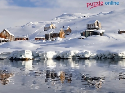 Wioska, Morze, Odbicie, Góry, Grenlandia, Domy, Śnieg