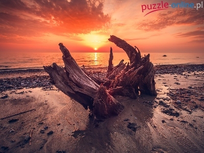 Wystające, Morze, Drzewa, Wschód słońca, Brzeg, Kłody