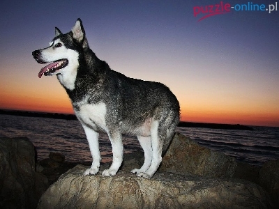 Puzzle Morze, Siberian Husky, Skała, Zachód Słońca