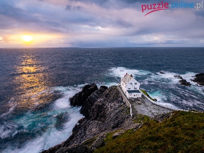 Morze Norweskie, Norwegia, Krakenes, Chmury, Latarnia morska, Skały, Zachód słońca