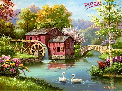 Puzzle Most, Młyn, Jezioro, Łabędzie