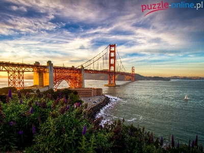 Puzzle Żaglówka, Rzeka, Most, Kwiaty