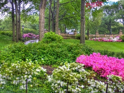 Mostek, Kwiaty, Park, Drzewa, Lampy