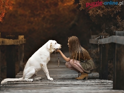 Puzzle Mostek, Dziewczyna, Pies, Las
