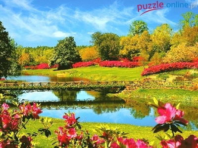 Mostek, Drzewa, Park, Rzeczka, Kwiaty