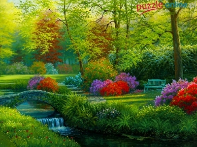 Mostek, Kwiaty, Park, Rzeczka, Ławka