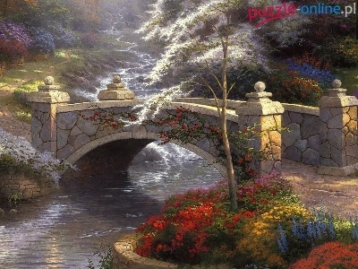 Mostek, Zieleń, Park, Rzeczka, Kwiaty