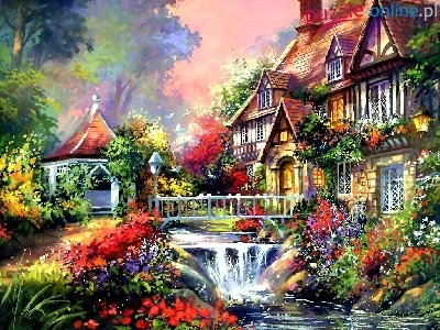 Mostek, Kwiaty, Dom, Rzeka, Altana