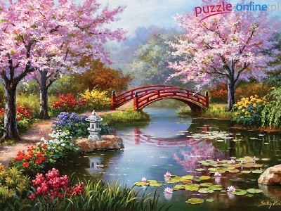 Puzzle Mostek, Park, Rzeka, Kwiaty