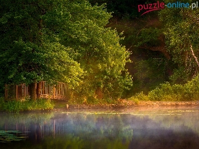 Mostek, Park, Mgła, Lato, Staw, Poranek