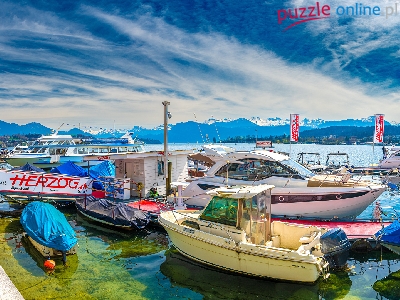 Jezioro, Motorówki, Przystań, Góry, Łódki