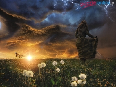 Motyl, Łąka, Fantasy, Burza, Dmuchawce, Kobieta