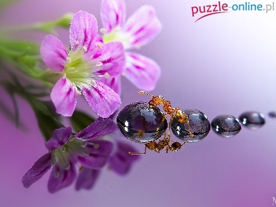 Mrówka, Makro, Kwiatki, Krople, Odbicie