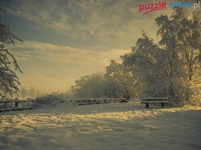 Śnieg, Ławka, Zima, Mróz, Drzewa