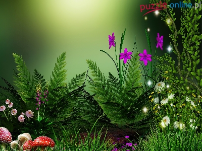 Puzzle Muchomorki, Grafika, Kwiaty, Paprocie