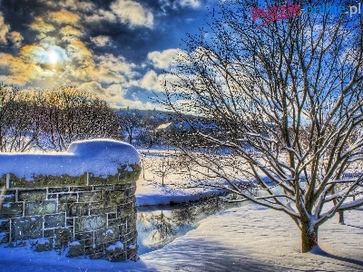 Mur, Drzewa, Zima, Åšnieg, Rzeczka