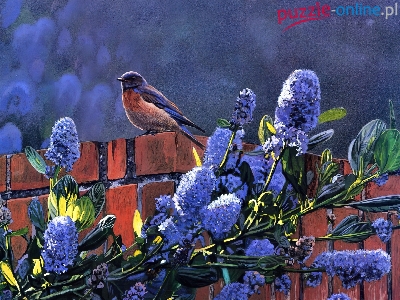 Mur, Niebieski, Kwiaty, Czerwono, Ptak, Liliowe