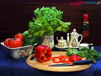 Naczynia, Pomidory, Nóż, Papryka, Sałata, Deseczka