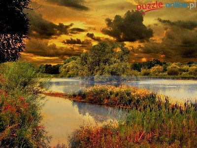 Nad, Jeziorem, Pochmurny, Zachód Słońca, Zarastającym