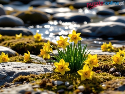 Mech, Żółte, Kwiaty, Narcyzy żonkile, Woda, Kamienie