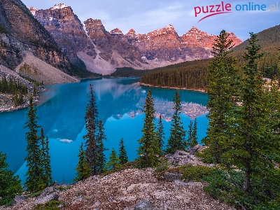 Drzewa, Skała, Moraine Lake, Alberta, Park Narodowy Banff, Jezioro, Kanada, Góry