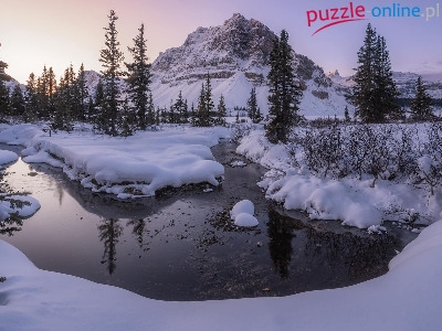 Drzewa, Wschód słońca, Zima, Alberta, Park Narodowy Banff, Jezioro, Kanada, Góry