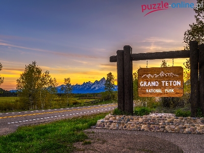 Drzewa, Stany Zjednoczone, Góry, Tablica, Park Narodowy Grand Teton, Wyoming, Droga