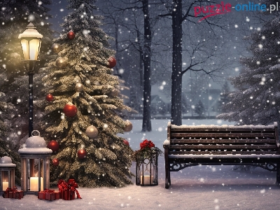 Ławka, Choinka, Boże Narodzenie, Lampiony, Grafika, Park