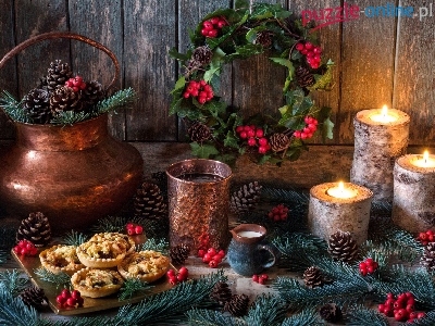 Boże Narodzenie, Ciasteczka, Ozdoby, Gałązki, Kompozycja, Świece, Szyszki