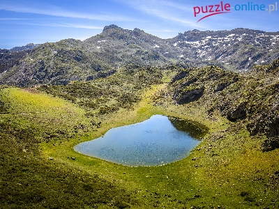 Góry, Asturia, Hiszpania, Rezerwat przyrody, Jezioro, Łąka, Niebo, Somiedo Natural Park, Trawa