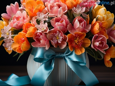Niebieska, Kolorowe, Wazon, Bukiet Kwiatów, Bukiet, Kwiaty, Wstążka Kwiat