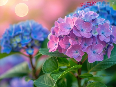 Kwiaty, Niebieska, Różowa, Liście, Hortensja