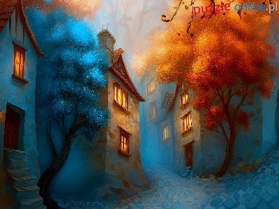 Drzewa, Uliczki, Domy, Niebieskie, Grafika AI, Czerwone
