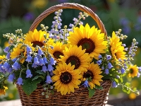 Wiklinowy, Słoneczniki, Kwiaty, Niebieskie, Koszyk, Dzwonki