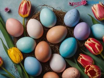 Niebieskie, Tło, Gniazdko, Żółto-czerwone, Tulipany, Pisanki, Kwiaty, Kolorowe