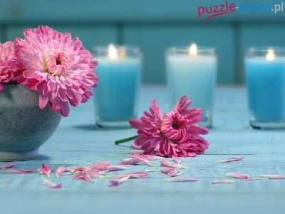 Niebieskie, Kwiaty, Dekoracja, Wazonik, Płatki, Świeczki