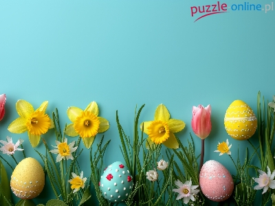 Tulipany, Pisanki, Żonkile, Niebieskie tło, Wielkanoc
