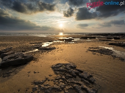 Plaża Dunraven Bay, Morze, Chmury, Wschód Słońca, Walia, Kamienie, Niebo