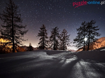 Niebo, Góry, Księżyc, Zima, Drzewa, Gwiazdy
