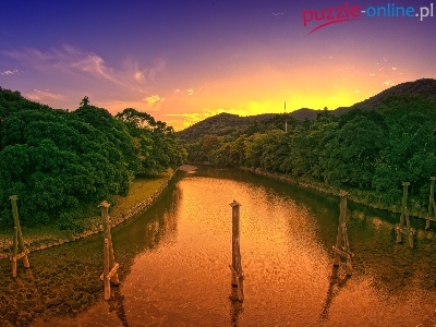 Niebo, Słońca, Rzeka, Drzewa, Zachód
