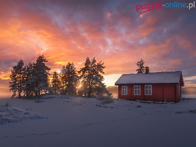 Śnieg, Zima, Drzewa, Zachód słońca, Dom, Pole, Niebo