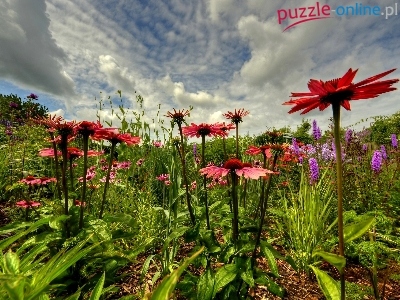 Niebo, Łąka, Kolorowe, Kwiaty, Chmury