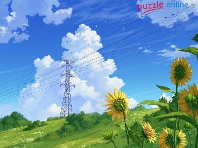 Niebo, Chmury, Słoneczniki, Linia elektroenergetyczna, Napowietrzna, Kwiaty, Budowla, Słupy