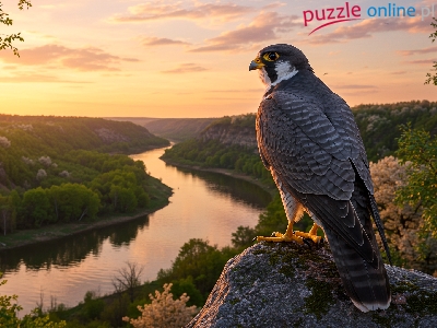 Niebo, Zachód słońca, Drzewa, Sokół, Kamień, Las, Ptak, Rzeka
