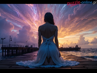 Siedząca, Chmury, Krajobraz, Sukienka, Osoba, Grafika, Zachód, Nabrzeże, Dziewczyna, Morze, Molo, Komputerowa, Fantasy Fantasy, Biała, Słońca, Niebo